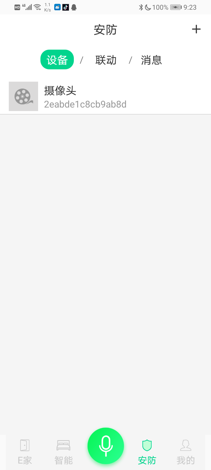 步骤1.在汉的智家APP,E家界面点击右上角+号,选择添加摄像头;见下图