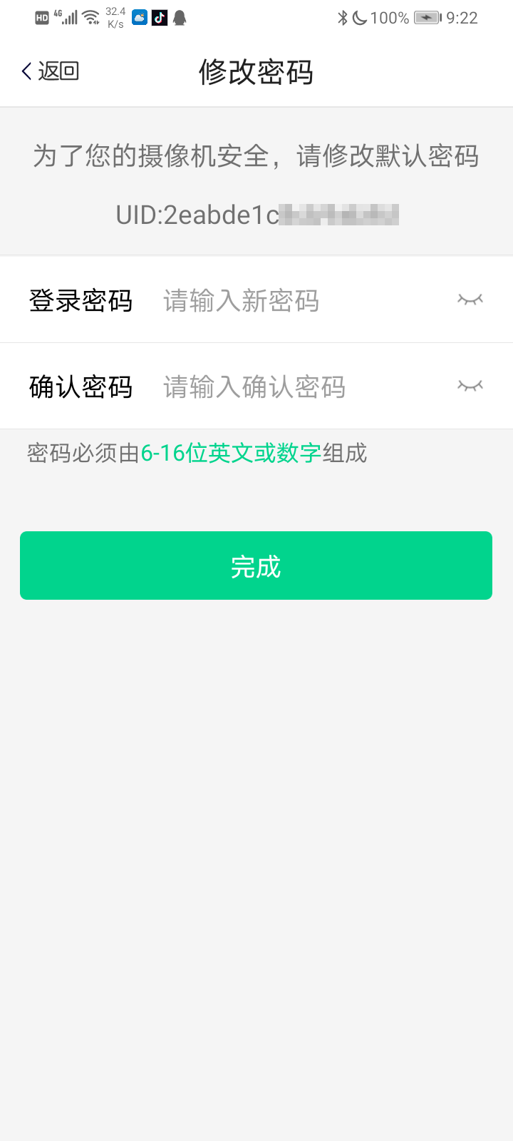步骤5.在密码界面中,输入登录密码以及确认密码,点击完成,进入添加摄像头界面(密码必须由6-16英文与数字组成)