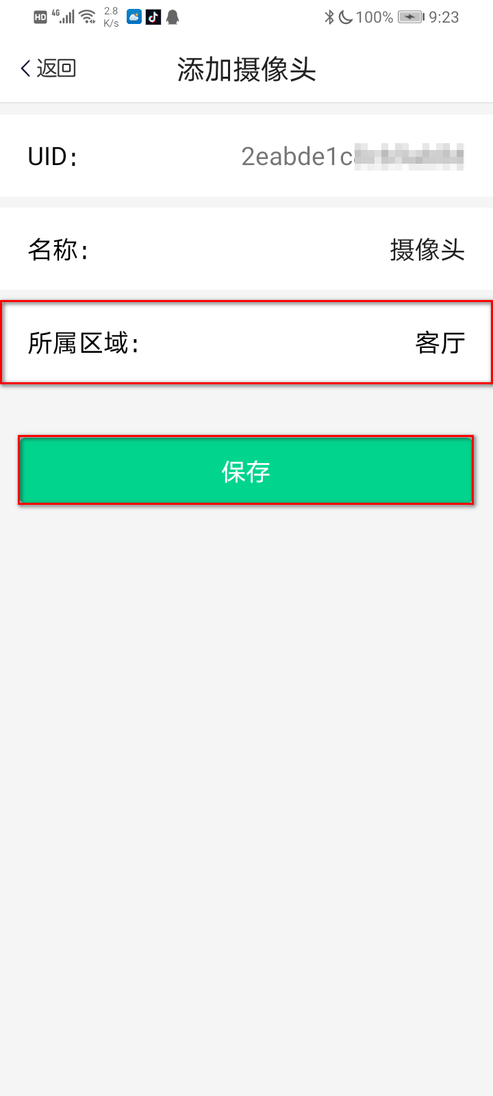步骤6.进入摄像头界面,可以自定义修改摄像头名称,选择摄像头的所属区域,点击保存,添加成功。