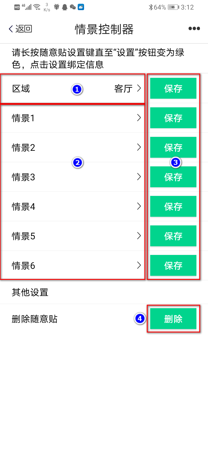 3.情景控制器的每一项内容设置好后都要单独点击右边的"保存"键,做保存