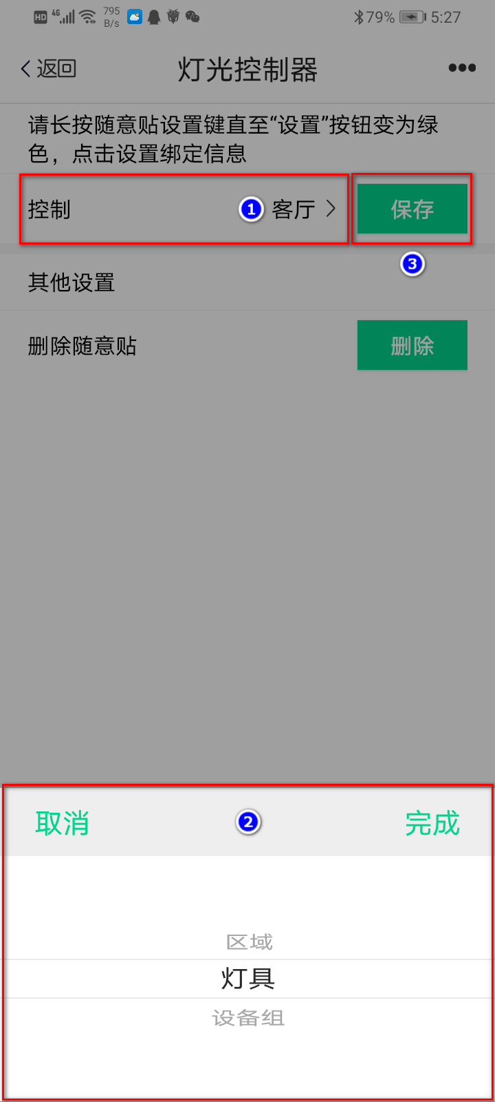 点击控制可以选择要控制的区域、某个灯具或者设备组,设置好后点击保存按钮保存。