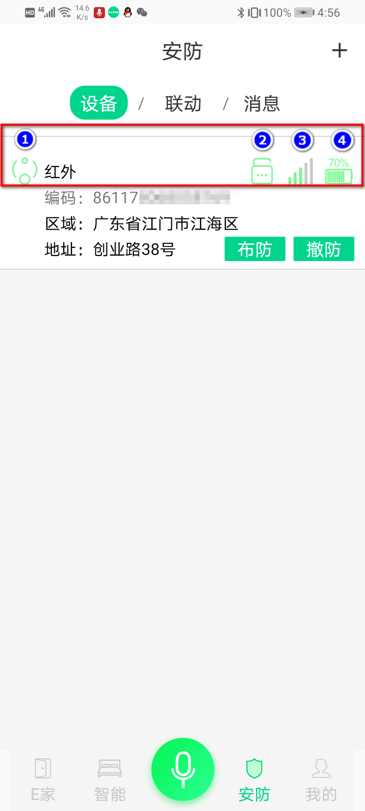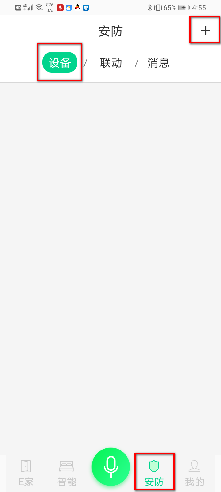 在我们手机登录汉的智家APP,切换到需要将红外报警器添加使用的家庭,点击下面菜单栏的“安防”,进入安防界面,选择“设备”,点击安防界面的右上角“+”号,进入安防的“添加设备”界面。可使用扫描设备IMEI码来添加设备,也可手动输入设备IMEI码来添加设备;