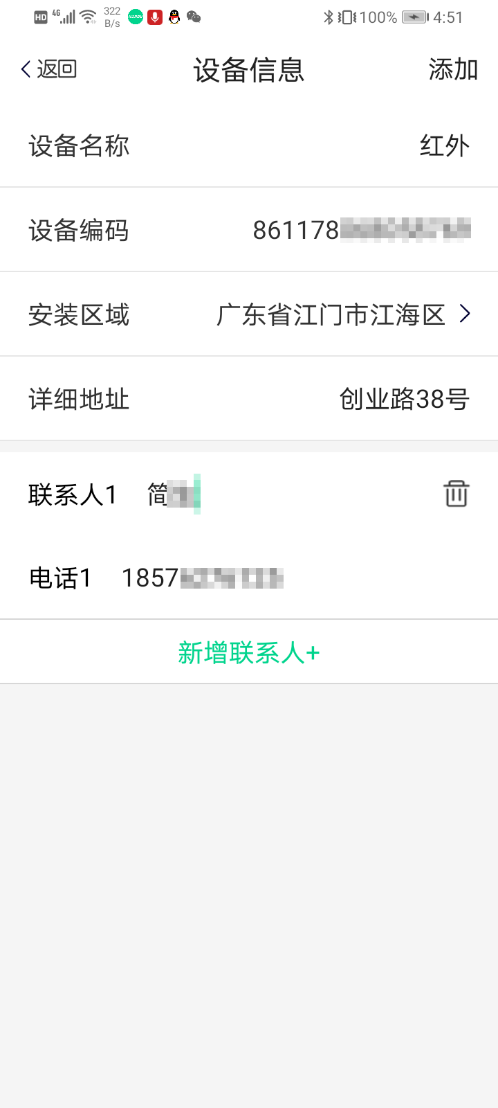 按要求填写安装区域、详细地址、联系人名字和电话(最多可填写5个联系人),点击右上角“添加”,添加完成。