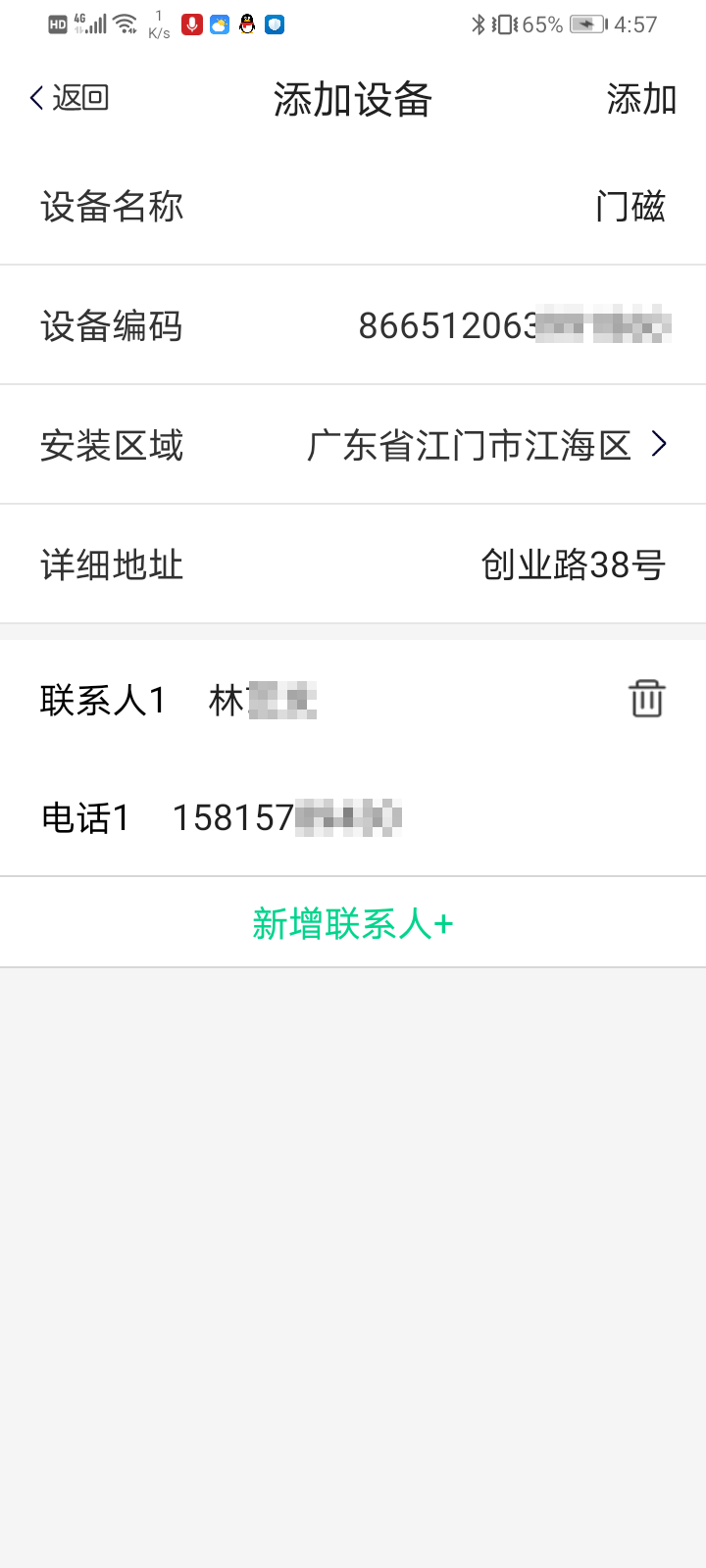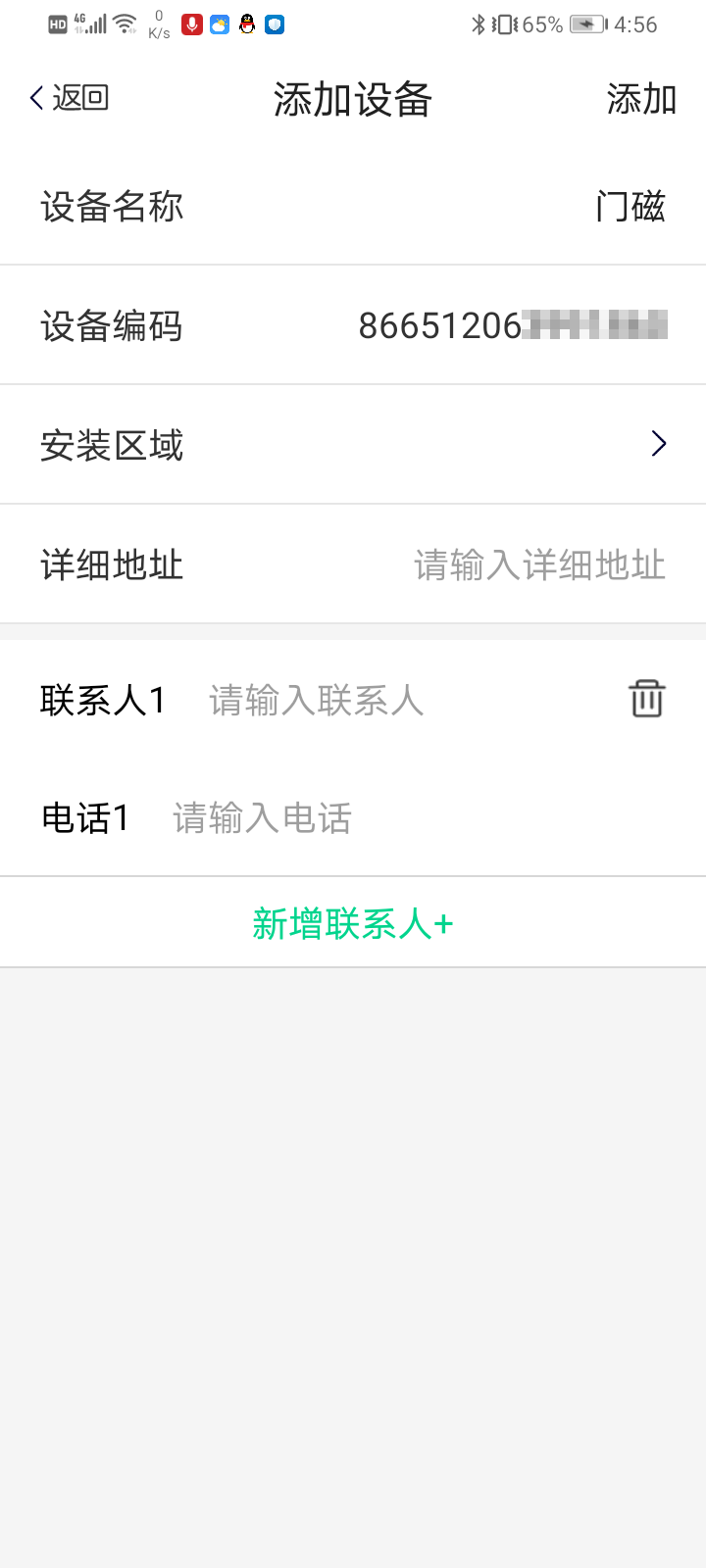 按要求填写安装区域、详细地址、联系人名字和电话(最多可填写5个联系人),点击右上角“添加”,添加完成。