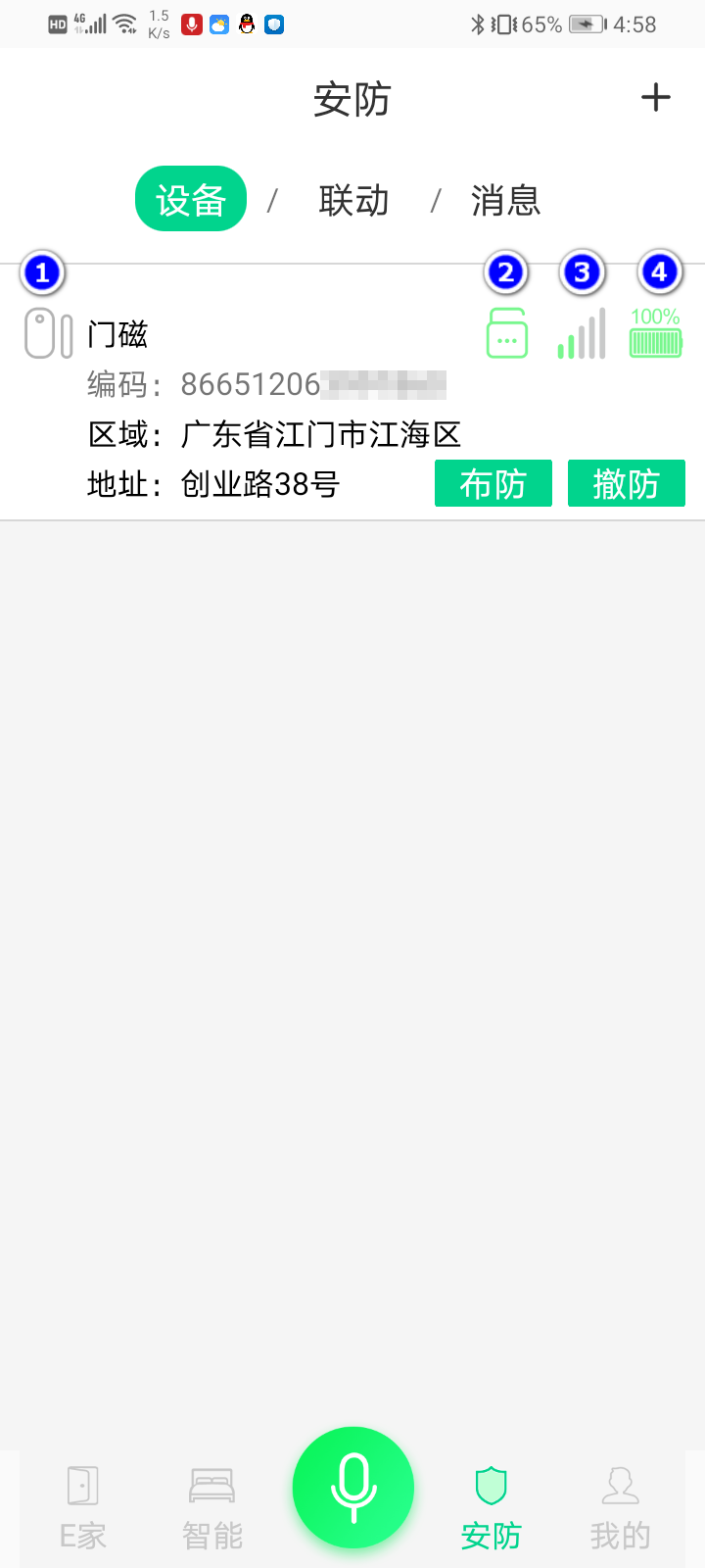 手机登录汉的智家APP,切换到需要将智能门磁添加使用的家庭,点击下面菜单栏的“安防”,进入安防界面,选择“设备”,点击安防界面的右上角“+”号,进入安防的“添加设备”界面。可使用扫描设备IMEI码来添加设备,也可手动输入设备IMEI码来添加设备;