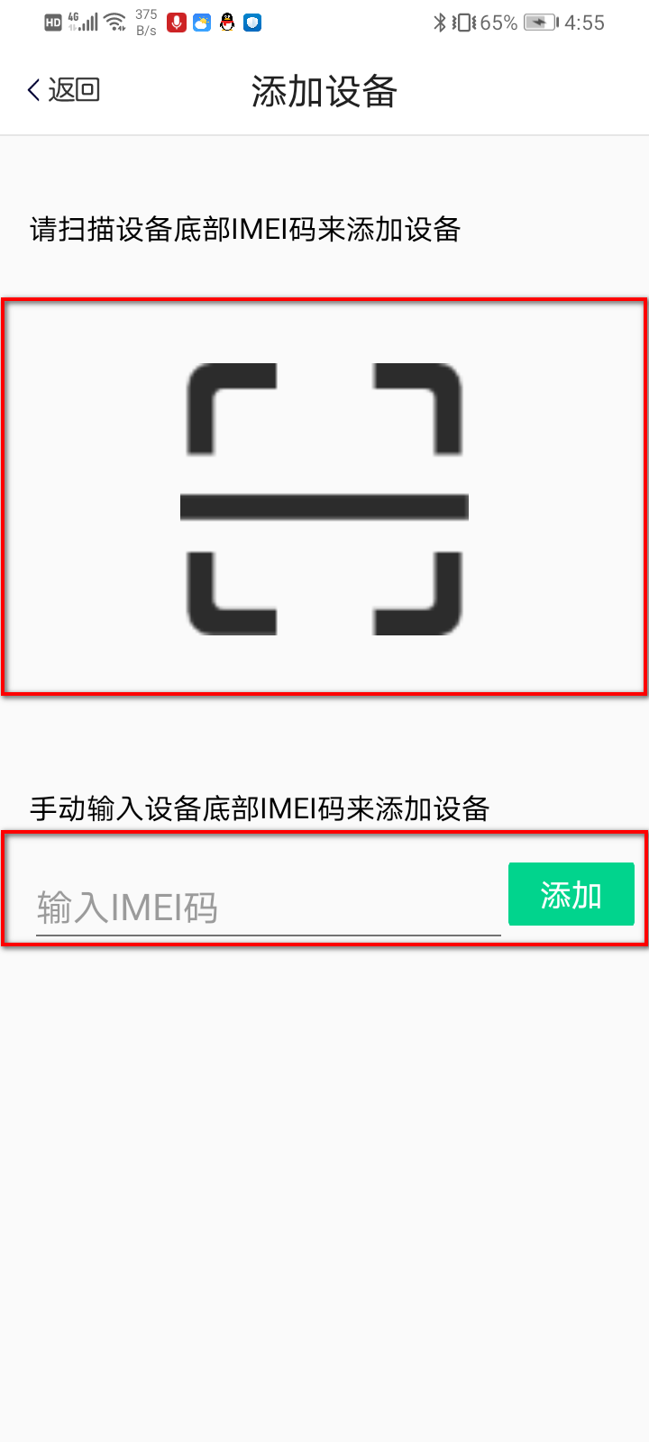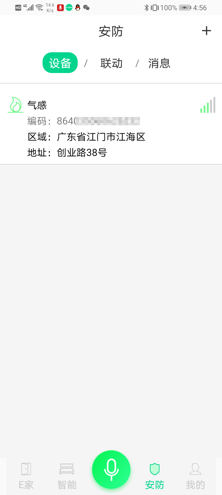 在我们手机登录汉的智家APP,切换到需要将燃气泄漏探测报警器添加使用的家庭,点击下面菜单栏的“安防”,进入安防界面,选择“设备”,点击安防界面的右上角“+”号,进入安防的“添加设备”界面。可使用扫描设备IMEI码来添加设备,也可手动输入设备IMEI码来添加设备;