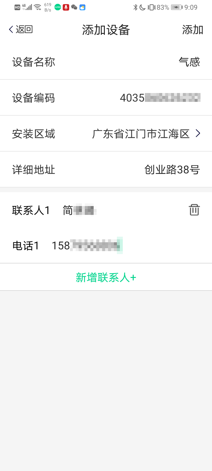 按要求填写安装区域、详细地址、联系人名字和电话(最多可填写5个联系人),点击右上角“添加”,添加完成。