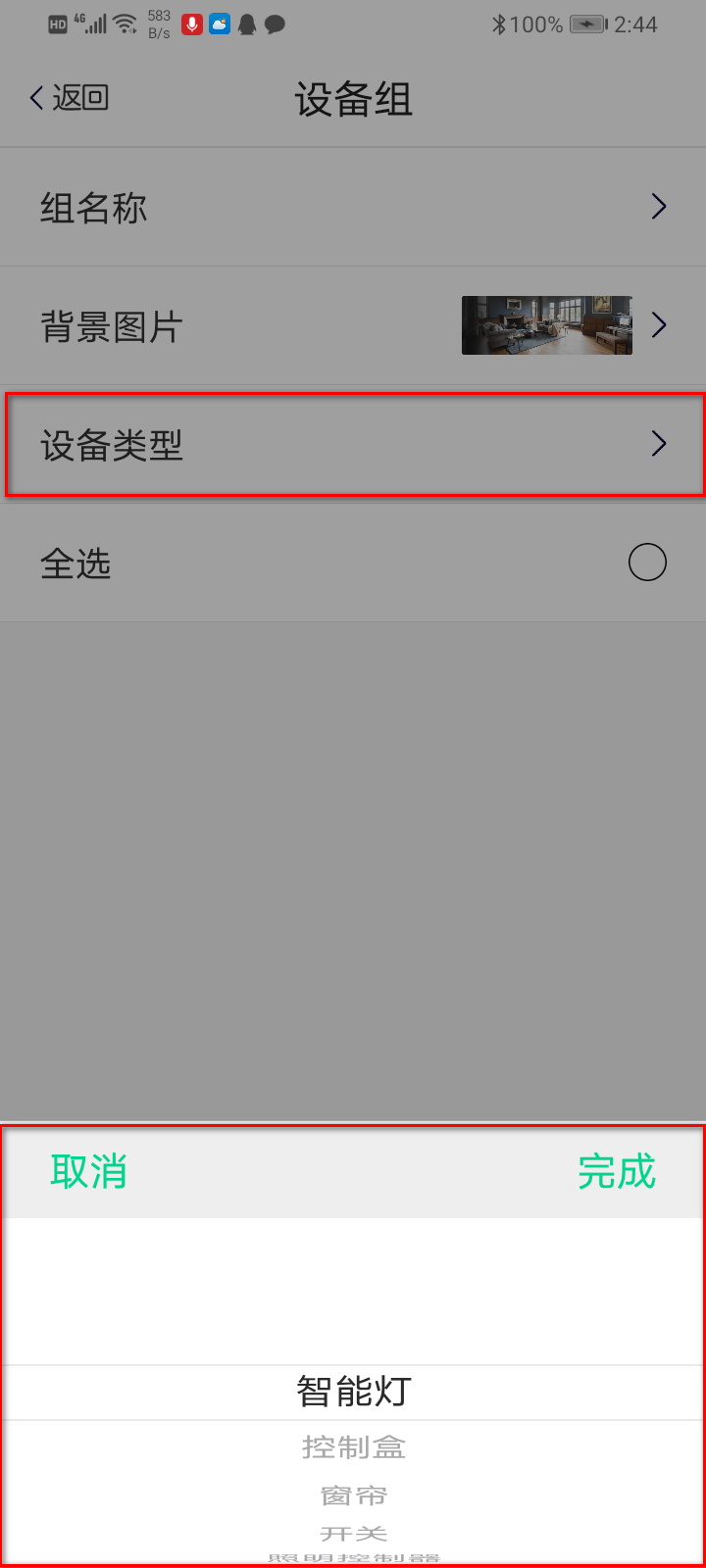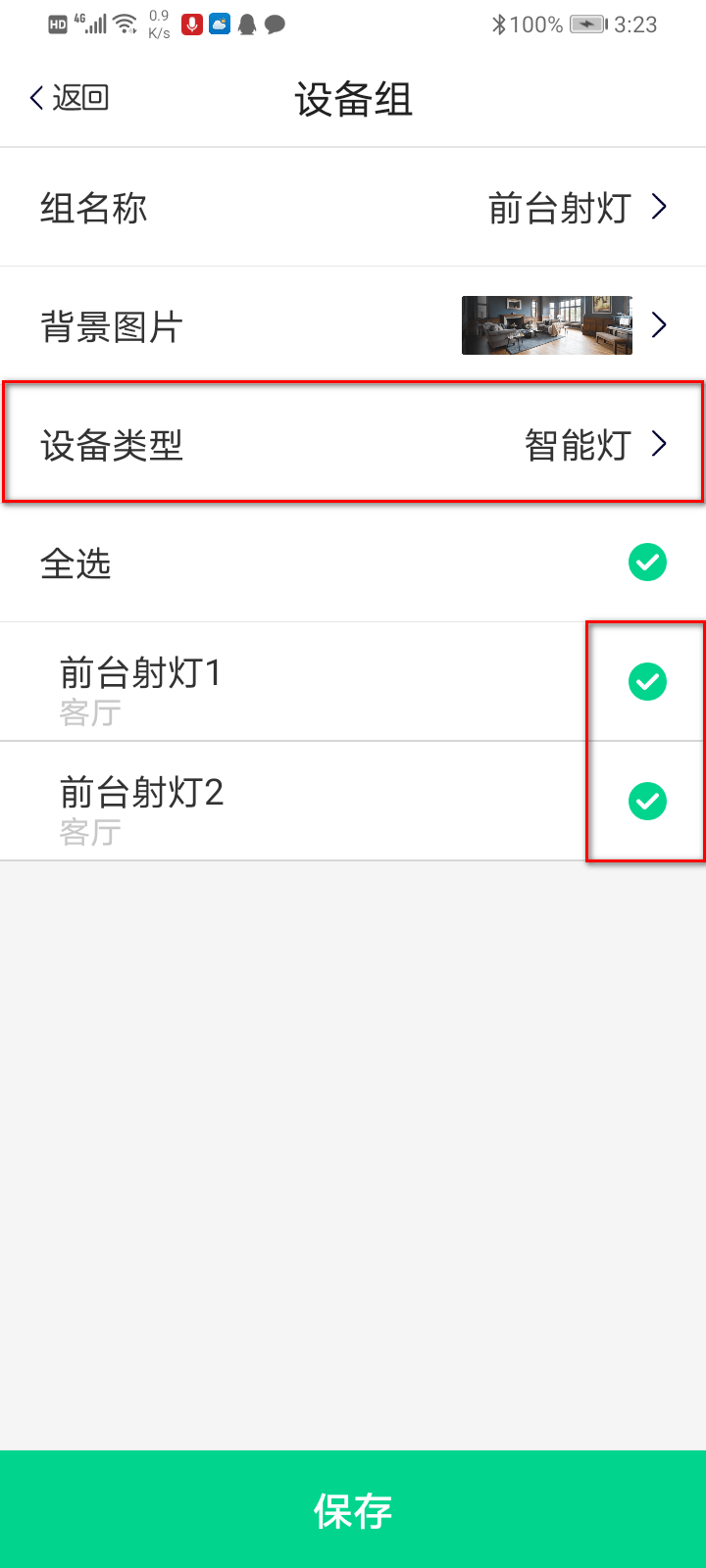 在新建设备组界面“输入名称”,选择所需要创建的设备类型(如选择智能灯),然后下方会显示当前家庭类型的设备,勾选需要用的设备,最后点击保存;如下图