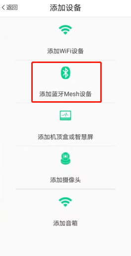 步骤2.在汉的智家APP,E家界面点击右上角+号,选择添加蓝牙Mesh设备;