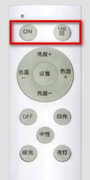 步骤1.同时长按遥控器最上方的“ON”键和“100/50”键,大约10秒直至指示灯闪烁后松手,这时可以看到指示灯闪烁,表示复位成功;