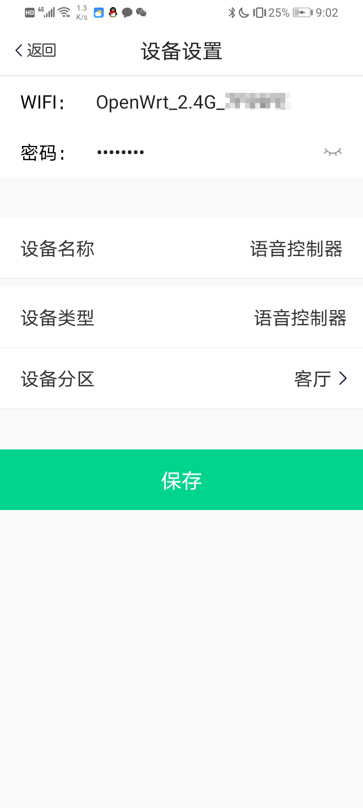 步骤5.跳转到设备设置界面,输入使用的WIFI密码,另外可对语音控制器重新命名,选择语音控制器放置的房间,然后点击保存,这时可听到语音播报:收到配网信息,正在努力联网,我已联网,随时听从你的吩咐;