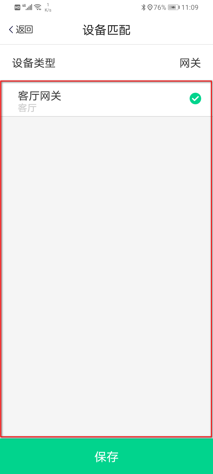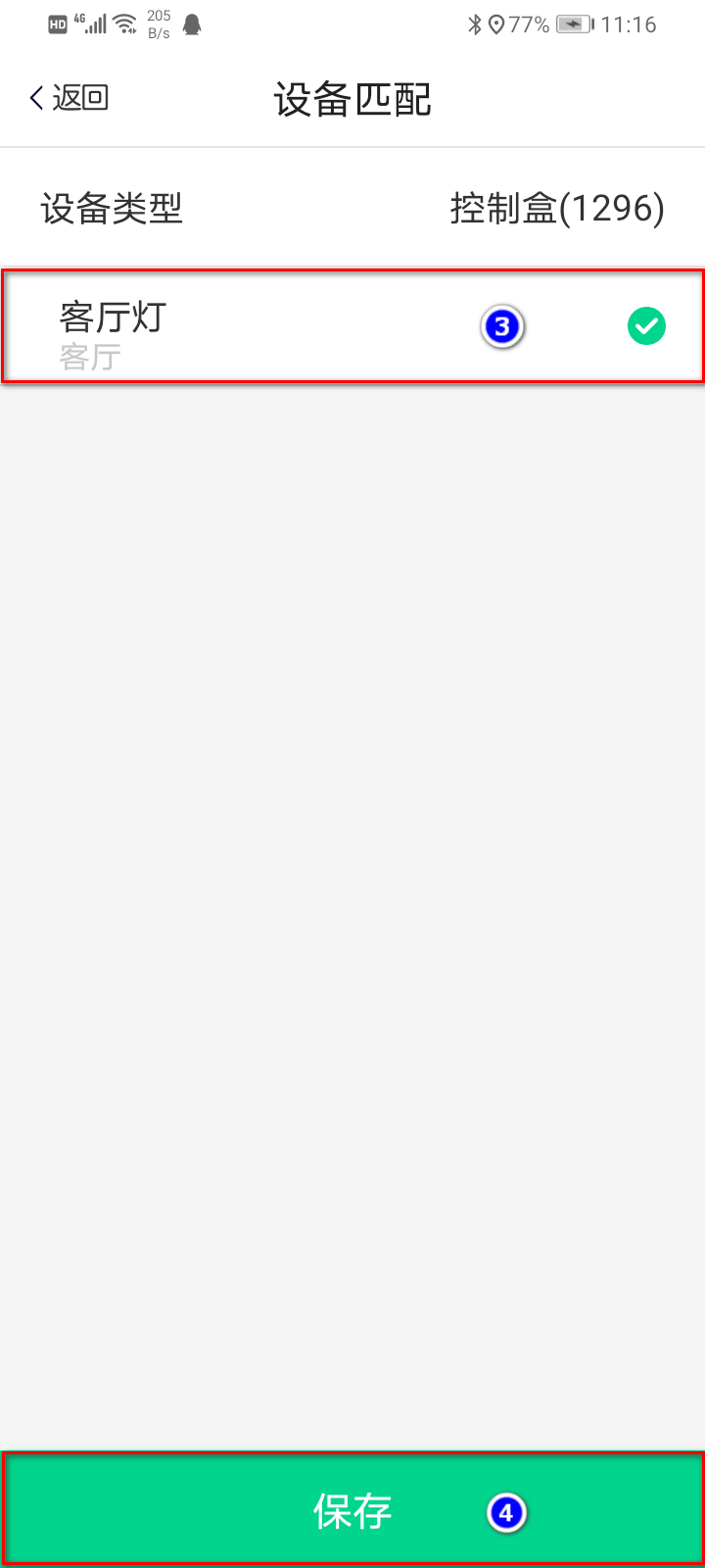 6) 添加设备,设备扫描出来后点击界面下面“待匹配设备列表”,可看到扫描出来的设备,通过右侧开关去控制设备从而可以知道该设备是哪个,安装在那个位置,然后点击设备名称跳转到设备匹配界面,点击和模板家庭同一设备名称后面的○,选中,再点击“保存”按钮,这样便完成了设备添加和匹配的操作;按同样的操作,将扫描到的其它设备都按模板的设备对应匹配好。返回主界面可看到匹配完的设备显示在线代表保存成功。