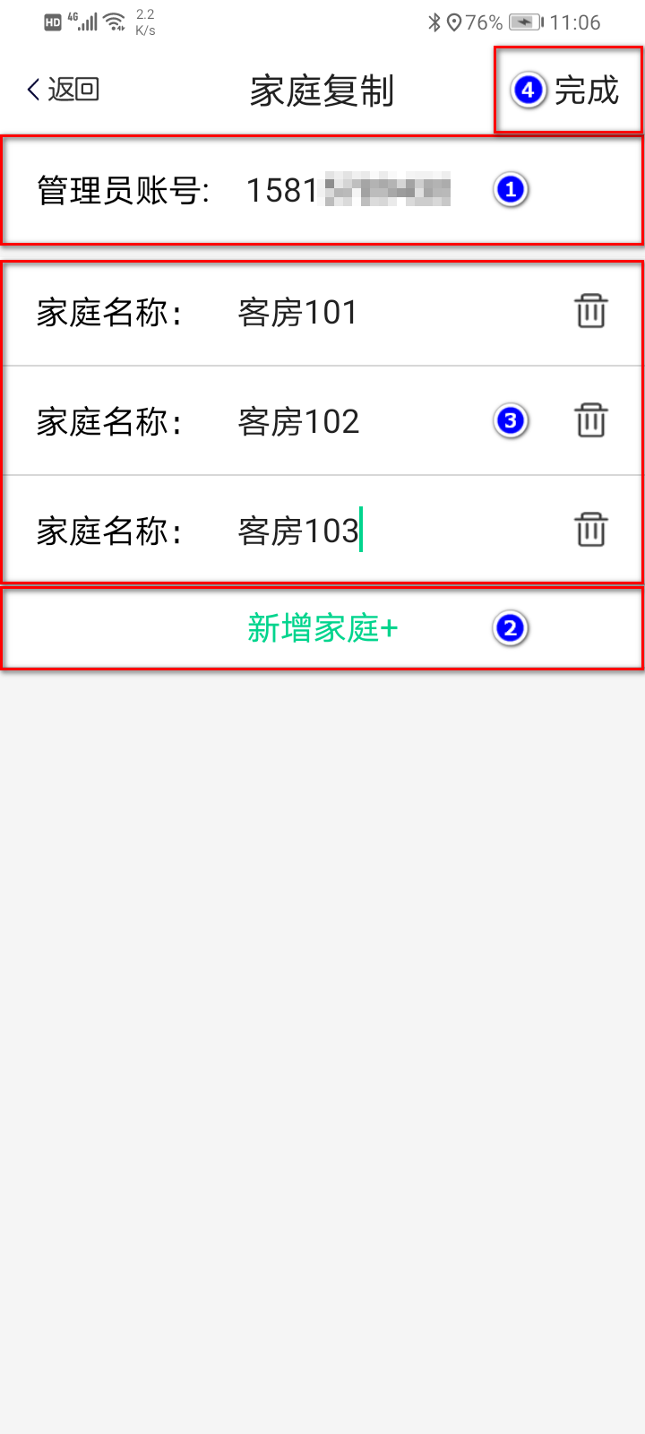3) 填写复制家庭信息,在家庭复制界面输入用来管理新家庭的汉的智家账号,然后点击“新增家庭+”,输入对应的家庭名称(房间号),如有多个家庭(房间)可以继续点“新增家庭+”进行添加,最后点完成;