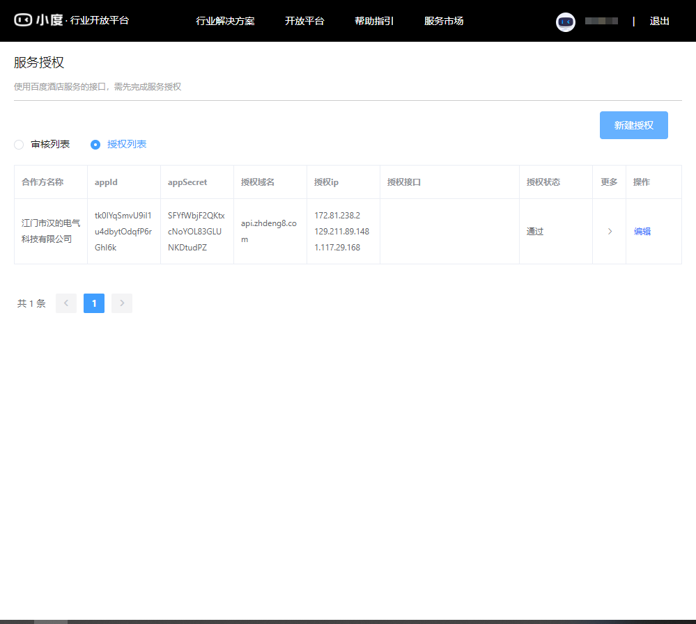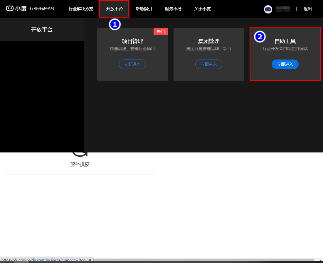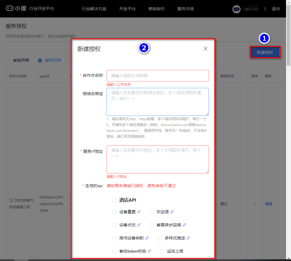步骤1:新建服务授权步骤,登录小度行业开发平台网站首页,点击开放平台-自助工具-服务授权-新建授权,根据教程末尾提供的授权信息填写并提交审核,审核通过后就可以再汉的易用宝APP上设置音箱欢迎语。