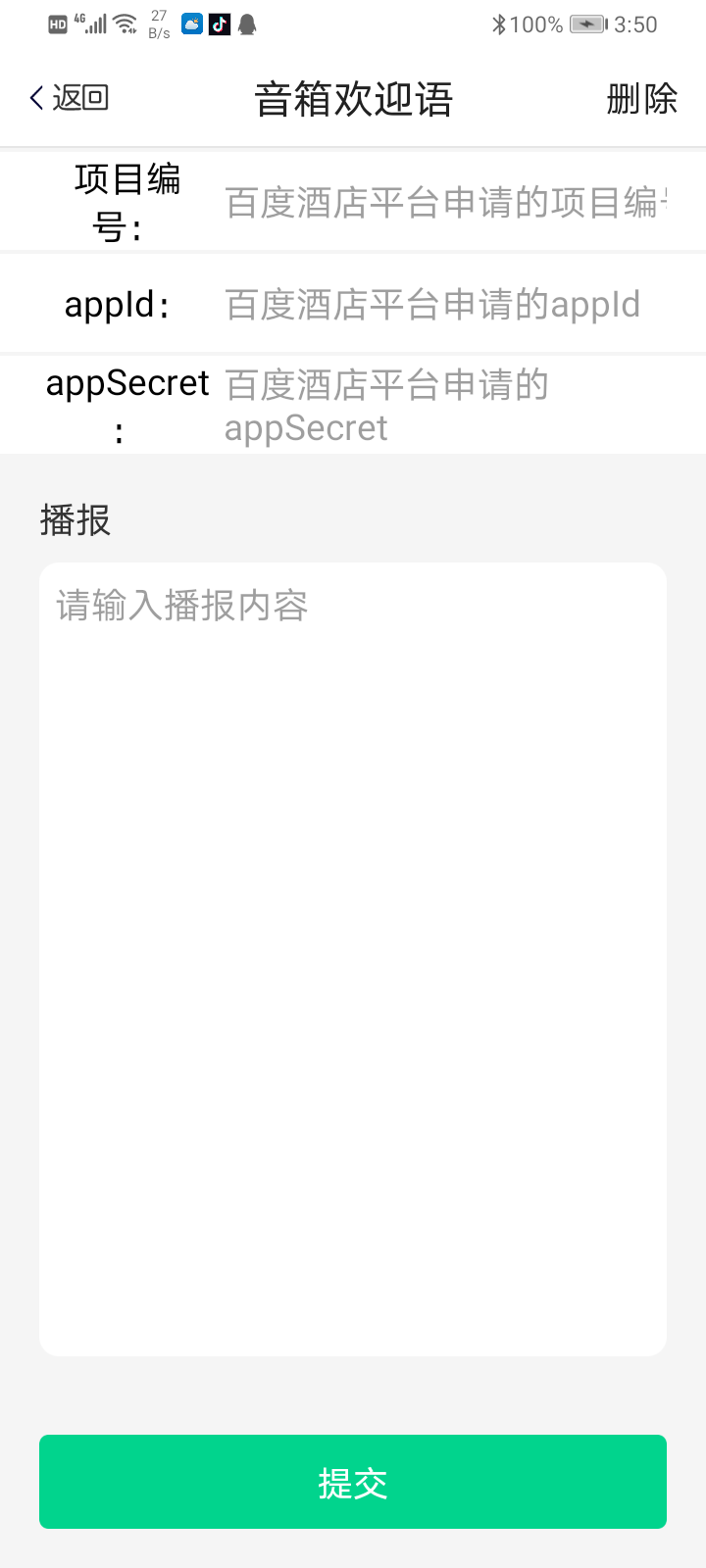 音箱欢迎语的使用,目前欢迎语使用家庭里必须要有以下设备:小网关、门显开关、百度音箱。每当门显开关上电时就会触发欢迎语。设置音箱欢迎语还需要使用百度酒店服务的接口,需先完成服务授权。
